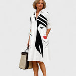 Sukienka Clara to synonim odważnej i swobodnej elegancji. Zaprojektowana, aby przyciągać uwagę z wyrafinowaną pewnością siebie, łączy ponadczasowy krój krawiecki z charakterystycznym artystycznym akcentem. Niezależnie od tego, czy uczestniczysz w otwarciu galerii, specjalnej kolacji czy eleganckim lunche, Clara pozostawi niezatarte wrażenie, nie wypowiadając ani słowa. Z nowoczesnym ilustracyjnym wzorem i płynna sylwetką w kształcie litery A, ta sukienka w stylu koszulowym łączy sztukę z modą. Sztywny kołnierz i monochromatyczna paleta są zakorzenione w wyrafinowaniu, podczas gdy unikalny projekt dekoltu dodaje odpowiedniego akcentu odwagi. Dla kobiet, które przekazują pewność siebie poprzez minimalizm z odrobiną oryginalności.