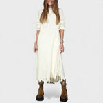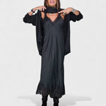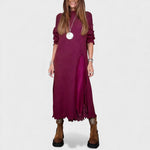 Połączenie dwóch części: Długi sweter dzianinowy z płynącą sukienką pod spodem – gotowy do noszenia.