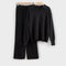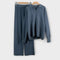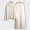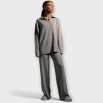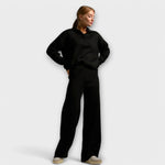 Kombinezon damski z eleganckiej dzianiny składający się z luźnego swetra i szerokich spodni. Wykonany z miękkiego i przyjemnego w dotyku materiału, zapewnia komfort i elegancki wygląd. Sweter ma lekko opadające ramiona i delikatny kołnierzyk, co nadaje mu nowoczesny charakter. Szerokie spodnie podkreślają casualowy i modny styl, idealne na chłodniejsze dni. Kombinezon jest doskonały zarówno na codzienne stylizacje, jak i na bardziej nieformalne wyjścia.